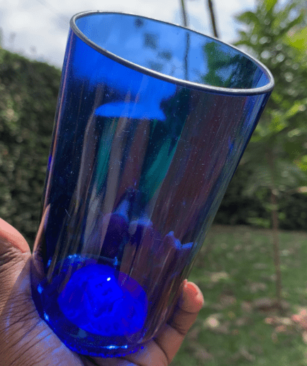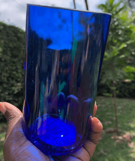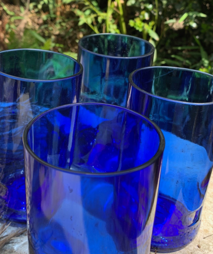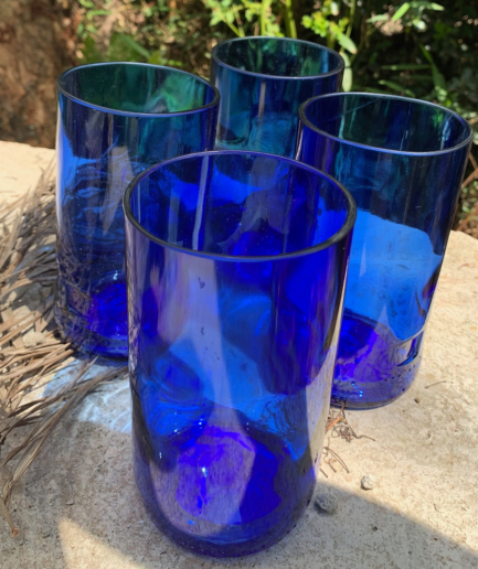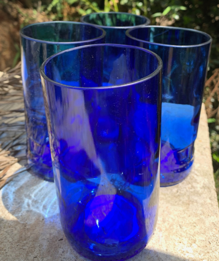 Set of 4 drinking tumblers made from hand cut, hand polished, cobalt blue glass bottle . You become part of the solution to landfill pollution when you choose our up-cycled pieces. We are turning trash to treasure a bottle at a time.